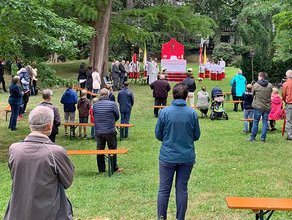 Die Deidesheimer hatten sich mit Genehmigung des Ordnungsamtes und unter Einhaltung der Corona Vorschriften im Buhlschen Park getroffen. Für musikalische Begleitung solgten einige Bläser. Auch die Messdiener beteiligten sich zahlreich unter Einhaltung der Abstandsregelungen. Pfarrer Braun brachte die Monstranz nach dem Gottesdienst in einer kleinen Prozession nur begleitet von Bläsern und Messdienern zur Kirche zurück