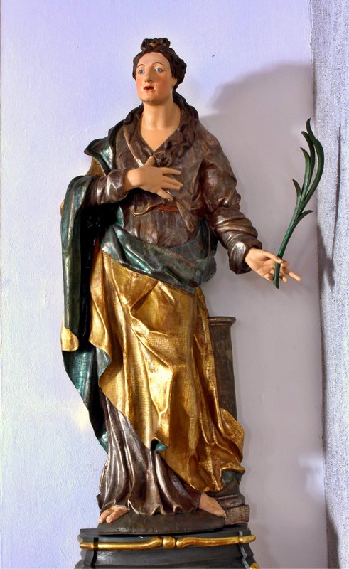 Diese Barockfigur einer Heiligen mit Säulenstumpf als Attribut wird heute aufgrund des Palmzweigs in der Hand als die heilige Barbara gedeutet. Sie stammt vom gleichen Künstler wie der heilige Josef. Die Figur wurde wohl zusammen mit dem ehemaligen Altar 1804 in der Kirche aufgestellt. Ihre Herkunft ist nicht bekannt. Möglicherweise stammt sie, wie weitere Figuren, aus der Kirche St. Paul in Worms oder anderen säkularisierten Wormser Kirchen.