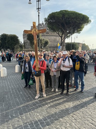 Der Morgen des zweiten Tages startete mit einem beeindruckenden und bewegenden Pilgerweg von der Engelsburg über die Via de la Conciliazione, über den Petersplatz in die Peterskirche. Gemeinsam beteten wir, verbunden über die Kopfhörer, vorne weg abwechselnd Pilgerinnen und Pilger, die ein Holzkreuz trugen und die Gruppe leiteten. Das Tragen des Kreuzes löste tiefe Berührung aus. Der Weg führte vom Obelisken auf dem Petersplatz hinein in den Petersdom durch die Heilige Pforte. Angekommen im Petersdom feierte die Reisegruppe einen Gottesdienst. Ein erhabenes Gefühl machte sich breit, in diesem denkwürdigen Dom, gemeinsam eine Messe zu feiern.